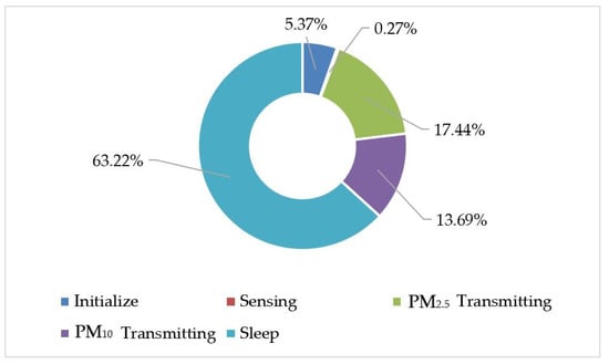 The percentage of power capacity requirement percentage is shown in Figure 16. The biggest part of the power consumption is 63.22% for sleep mode, 17.44% for PM2.5 transmitting, 13.69% for PM10 transmitting, 5.37% for sensing, and 0.27% for initializing.