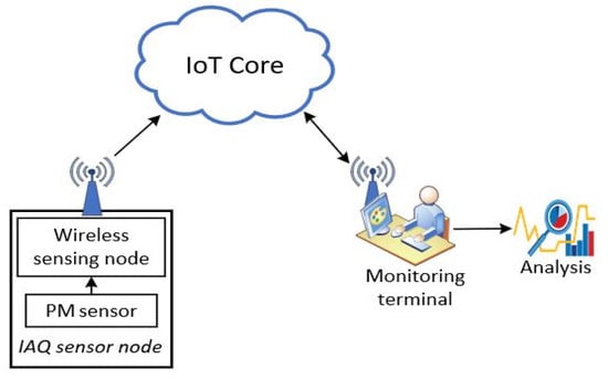 The configuration of the system is shown in Figure 18. It started measuring PM concentration by the sensor node, which was connected to the Wi-Fi, then the data was sent to the IoT core in the cloud. Therefore, Adafruit can take the data from the IoT core for monitoring to be analyzed, and our equation was defined before the equation appeared or immediately following.