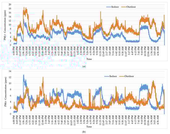 Indoor PM usually comes from cleaning and smoking tobacco, dust mites, aerosol sprays, pets, insufficient setting gas stoves and furnaces, kindle candles, or burning solid fuel. In many cases, outdoor air infiltration can affect indoor PM concentrations []. This infiltration can either increase or decrease indoor PM concentration, depending on the outdoor PM level [,].