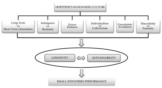 We believe that small industries should not only be able to survive across generations but must also have good economic, social, and environmental performance. These need to be prepared because the process is certainly not easy, especially for small industries. So far, there is no standard measure of sustainability for small industries. Enderle [] argued that overall, the current sustainability reporting standards commonly used by large industries might not be suitable for small industries because they were developed with general reference to large businesses. Some experts then used a variety of simpler attributes considered suitable for measuring sustainability in small industries. Economic performance is measured by the attributes of sales growth, market share, cost reduction, and profitability. Social performance is measured by the attributes of health standards for workers, employee satisfaction, customer satisfaction, relations with stakeholders, and community involvement in the business. Meanwhile, environmental performance is measured by product safety and health attributes, waste management, and factory safety and health [,,,,,,,]. Figure 1 presents our proposition to explore the effects of traditional culture on the longevity and sustainability of Sundanese businesses.