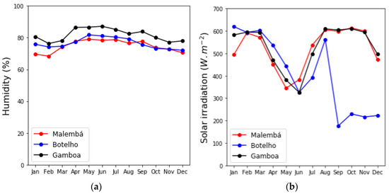 Figure 2 shows how the meteorological variables portray the characteristics of the location of each station. Gamboa, for example, has higher humidity and lower wind speed than the other two for all months of the year. When evaluating solar irradiation, Botelho has higher values during the summer (January–May), and for the other months, its solar irradiation profile is lower. A sudden drop in solar irradiation is observed at the Botelho station (Figure 2b) in the months of September–October–November–December, which must have occurred due to the presence of more constant clouds in the region (station located on an island). Malembá and Botelho have similar behaviors for wind speed. However, Malembá has more constant winds on average. Regarding the wind direction, Figure 3 shows that the wind increased during the study period.