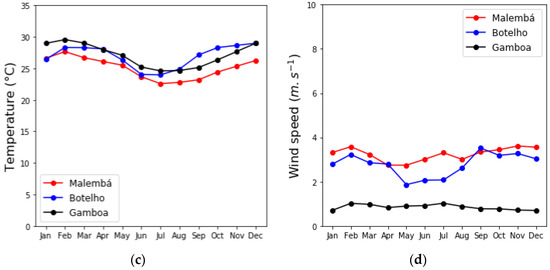 The air quality of the port complex is continuously monitored by monitoring stations located in Botelho, Gamboa and Malembá [41], as shown in Figure 1. The pollutants evaluated in this study are NOx (nitrogen oxide), O3 (ozone) and PM10 (particulate matter smaller than 10 μm). Observations of meteorological variables and pollutant concentrations are reported as hourly average values for the year 2019. In this sense, a preliminary analysis of the behavior of meteorological variables (humidity, solar irradiation, temperature and wind speed) during the period under analysis is important. Figure 2 shows the behavior of the monthly average of each meteorological variable.