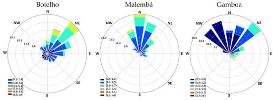 Figure 3 shows a higher intensity preferential wind (3.5 to 6 ms−1) coming from the NE to the Botelho station. For the Malembá station, higher intensity winds (3.9 to 7 ms−1) are observed coming from the N direction. For the Gamboa station, wind is also observed coming from the NE/E direction (1.5 to 3 ms−1). However, at this station, most of the time, the NW wind has low intensity (0.1 to 0.8 ms−1). This is due, in part, to the presence of many trees (forest) in its surroundings.
