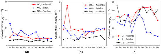 Monthly average for the concentration of pollutants: (a) NOx, (b) PM10 and (c) O3.