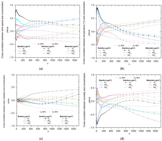 Regarding PM10, we identified a negative cross-correlation between wind velocity, temperature and solar irradiation for smaller temporal scales (1 day) at all stations. For the wind variable at the Botelho station, around 100 h, the correlation becomes positive until the end of the period. For the Malembá station, the correlation becomes positive at 50 h, reaching a maximum around 500 h, then decreases, but remains positive. At the Gamboa station, it remains negative until the end of the period. For the temperature variable, the three stations present a negative correlation, with a maximum around 24 h. For the Botelho station, it starts to be positive around 50 h, reaching a maximum at 200 h, becoming negative around 800 h until the end of the period. At the Gamboa station, it starts to be positive around 100 h and reaches a maximum at 400 h, becoming negative at 1000 h. At the Malembá station, it becomes positive around 150 h with a tendency to increase until the end of the period. For the variable solar irradiation, negligible behavior is observed. For the humidity variable, a greater positive correlation is observed for the Malembá station, becoming negative around 200 h and remaining until the end of the period. At the Botelho station, there is a positive correlation with a maximum in 24 h, becoming negative around 100 h. At the Gamboa station, there is a small negative correlation for almost the entire period.