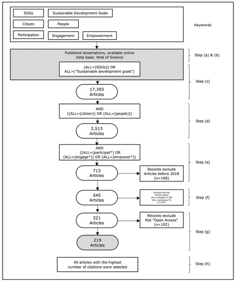 The purpose of this research is to critically analyze the state of citizen participation in recent initiatives to achieve the Sustainable Development Goals (SDGs) and the challenges it faces. Because the SDGs cover a wide range of topics, methodologies, etc., in this research, we used a systematic literature review to analyze the SDGs with the aim of identifying recent areas of exploration and emerging questions. This review was conducted using the methodological model proposed by [1] in their study on the importance of rigor in documenting the literature search process. They proposed a five-phase methodological model for this process: (1) definition of the review scope; (2) conceptualization of topic; (3) literature search; (4) literature analysis and synthesis; and (5) research agenda. This framework is described in the following sections.