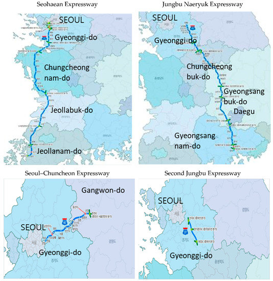 The results of previous studies establish that socioeconomic factors, environmental issues, and transportation facilities reduce the physical distance between regions. This study examined if the impact of highway construction accelerated migration into the construction area due to improved transportation facilities and accessibility. This study analyzed four representative highway sections among the 51 highway routes in Korea, as of 2019: Seohaean Expressway, Jungbu Naeryuk Expressway, Seoul–Chuncheon Expressway, and Second Jungbu Expressway(Table 1). The highways selected were completed after 2000 for the ease of obtaining local data, avoiding the redundancy of route locations and reflecting the diversity of the construction areas and route length. The Gyeongbu Expressway, the most representative expressway in Korea that was completed in 1970, was excluded from the analysis because it was difficult to determine the exact outcome due to limited regional data (Figure 1).