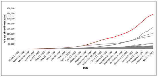 The pandemic in Indonesia started in early March 2020 and reached 56,385 confirmed cases, with 2876 deaths by the end of June 2021 [18,19,20]. Jakarta, as the country’s most populace city in Indonesia (15,907 people per km2 by 2020, based on [21]), has suffered from the highest number of confirmed cases during the first year of the pandemic period (see Figure 1). Figure 1 shows an increasing trend during the observation window (March 2020–March 2021) in COVID-19 cases in Jakarta. From early to mid-2020 (March–July), the case numbers were still below 50,000 but then started going up continuously until reaching 50,000 cases in September. The number then doubled in November and became 150,000 at the end of 2020. The positive cases remained high the following year and hit nearly 350,000 in March 2021.