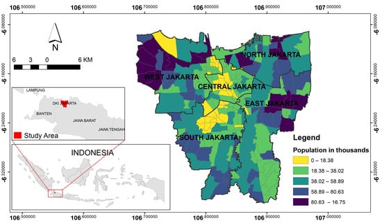 Location of study area showing the population distribution. The population number is in thousands of people (analyzed from gis.dukcapil.kemendagri.go.id, accessed on 23 January 2022).