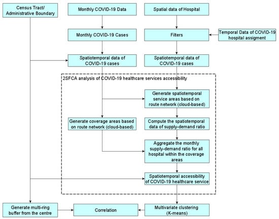 A two-step floating catchment area (2SFCA) [34] was used to analyze the accessibility of COVID-19 healthcare (see Figure 3) to the monthly data from the COVID-19 infected population. The 2SFCA method [34] measures the spatial accessibility of COVID-19 designated hospitals based on the spatial interaction between supply and demand. Initially, this method evaluates physical accessibility to health care services based on a gravity model and spatial decomposition method [39,42].