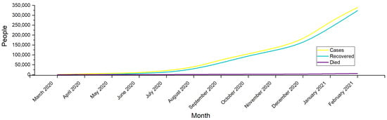COVID-19 cases in Jakarta continued to increase from March 2020 to February 2021. Nearly 350,000 cases were confirmed by February 2021 (Figure 4). However, this was followed by a high recovery rate in COVID-19 patients. Based on data from January 2021, DKI Jakarta became one of the provinces with a >80% recovery rate out of the 16 provinces in Indonesia [47]. Meanwhile, the death rate due to COVID-19 has also increased from time to time. Based on the graph, the number of cases, recovery, and death rates due to COVID-19 have parallel increasing trends.