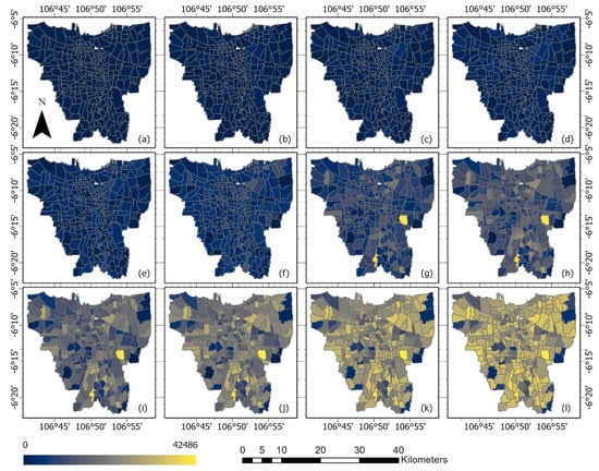 Spatiotemporal accessibility of healthcare from the infected population ((a) March 2020, (b) April 2020, (c) May 2020, (d) June 2020, (e) July 2020, (f) August 2020, (g) September 2020, (h) October 2020, (i) November 2020, (j) December 2020, (k) January 2021, (l) February 2021).