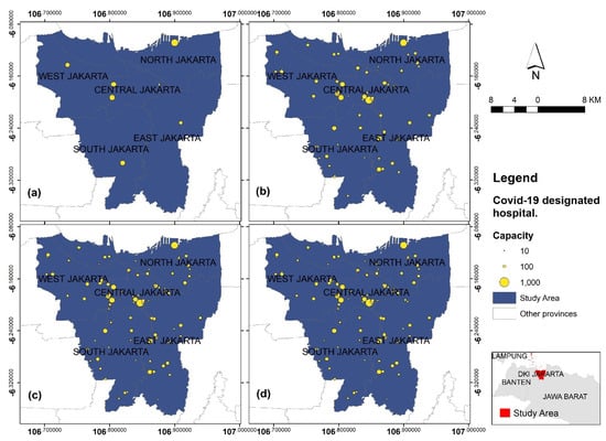As shown in Figure 6, different hospitals have been assigned to serve COVID-19 patients at different times. Between April 2020 and March 2021, the number of hospitals assigned grew. Figure 6a depicts six hospitals at the start of the pandemic, 30 in May 2020, and 45 from September to December 2020. The 59 hospitals assigned in January 2021 are shown in Figure 6d. Figure 6’s addition of hospitals does not match Figure 5’s distribution of cases since the added facilities are all in Central Jakarta. East Jakarta’s hospitals, the most densely populated area, clearly have limited capacity.