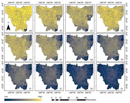 Figure 8 illustrates the temporal distribution of accessibility. By the end of the period, average accessibility had decreased while the number of infected people had also increased. The worst condition was reached in January 2021, when the total number of confirmed cases increased by 71% at the national level [52] that was started from two cases in March [53]. The figure also shows that increasing the number of hospitals from 6 to 30 by June 2020 significantly affected healthcare accessibility. However, adding 15 hospitals in September did not significantly improve conditions compared to August 2020. This was because the rules were stricter from April to June 2020, known as Large-Scale Social Restrictions (PSBB) [54], whereas from June to September, the policy used was the Transitional PSBB, which allowed workers to enter offline (WFO) with 50% capacity.