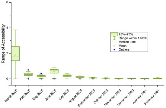 When the pandemic began in March 2020, the level of healthcare accessibility for the COVID-19-infected population in Jakarta was reported to be high (Figure 7). Between April and May of 2020, accessibility was reduced. Some areas have less access to healthcare facilities due to increased COVID-19 cases. Although adding new hospitals in June helped improve accessibility, accessibility slightly decreased from July 2020 to February 2021.