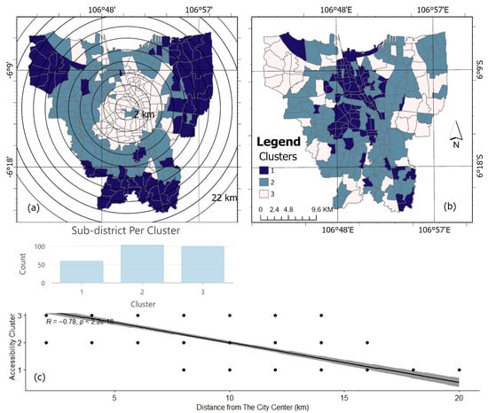 Figure 9a shows the results of the multivariate clusters of accessibility based on twelve-month spatial data of accessibility. There are 60 sub-districts categorized in low accessibility (cluster 1), and each of 100 sub-districts for moderate (cluster 2) and high accessibility (cluster 3). During the research time, certain areas outside of Jakarta are less accessible to healthcare compared to the inner city. On the contrary, the inner city is less populated compared to the outskirt as illustrated in Figure 9b. The accessibility is strongly correlated with the distance from the center of the city of Jakarta (Figure 9c). The farther from the inner city, the lower the accessibility (R = −0.78, ρ < 2.2 × 10−16).