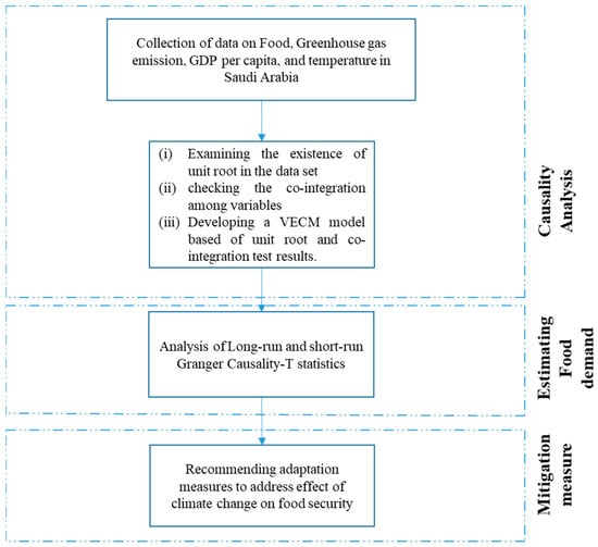 An overview of the procedures used in this investigation is shown in Figure 2. As can be seen from the figure that firstly data related to food (imported and produced) and climatic as well as socio-economic parameters were collected from the open literature. The same data were used for causality analysis. Based on the results of the causality analysis, long-term and short-term demands are predicted. Finally, different mitigation measures to combat the effect of climate change on food security are critically discussed.