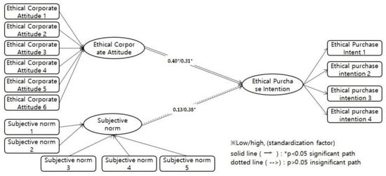 Applying subjective norms in the theoretical framework of this study, it is arguable that corporate image does not directly affect purchase behavior, but affects behavior through subjective evaluation of the behavior through social pressure imposed on buying products from ethical firms. With this rationale, this study modified the definition used by Fishbein and Ajzen [21] to conceptually define it as ‘the extent to which one subjects the purchase of ethical firm’s products to the social pressure from the reference group’. It was assumed that subjective norms for ethical companies are significant indicators that induce consumers to engage in desired purchase behavior.