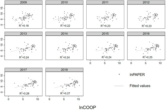 The scatterplot and fitting line of the relationship between scientific collaboration and knowledge production in the Belt and Road countries from 2009 to 2018 (Figure 1) show the distribution and aggregation of data and reflect the essential correlation and dynamic changes of the two core variables in this study.