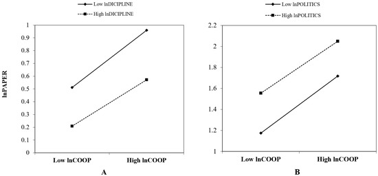 The moderating effects of the number of specialized disciplines and political stability on the influence of scientific collaboration on knowledge production. (A). The moderating effect of the number of specialized disciplines on the influence of scientific collaboration on knowledge production. The values of lnCOOP are divided into high value (dotted line) and low value (solid line) by adding and subtracting the standard deviation based on its average value. The other variables are processes in the same way. The slope of solid line indicates the negative regulation of the number of specialized disciplines. The slope of dotted line indicates the positive regulation of the number of specialized disciplines. The larger absolute value of the slope of the solid line or the slope of the dotted line indicates that its moderating effect is more significant. (B). The moderating effect of political stability on the influence of scientific collaboration on knowledge production. Its explanation is similar to that of Figure 2A.
