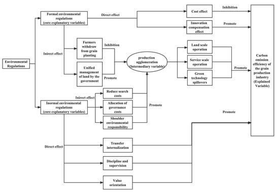 In order to more clearly show the different impact mechanisms of heterogeneous environmental regulations on the carbon emission efficiency of the grain planting industry, a flow chart is drawn, as shown in Figure 1.