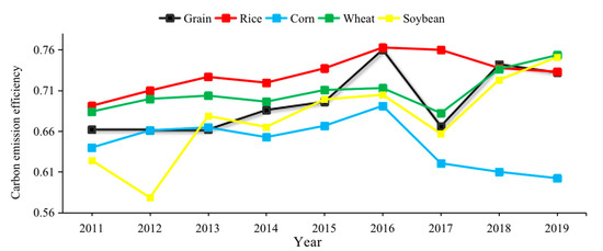 Furthermore, measuring the production carbon emission efficiency of China’s four major grain crops (rice, corn, wheat, and soybean; the planting area of these four crops accounts for 80% of the total food crops) from 2011 to 2019 and the results are also shown in Figure 2. It can be seen from the figures that in recent years, the carbon emission efficiency of rice, wheat, and soybean has had an upward trend, but the carbon emission efficiency of corn has decreased year by year. In 2017–2019, the carbon emission efficiency of corn planting was the lowest and far lower than the other three staple crops.