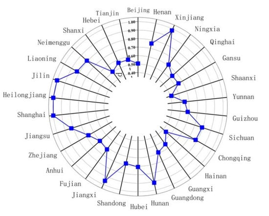 The grain production industry’s carbon emission efficiency in China was measured using MAX-DEA software, and the results are shown in Figure 2. From 2011 to 2019, China’s grain production industry’s carbon emission efficiency showed an overall upward trend, which is inseparable from the concept of green development advocated for many years in China. Further dividing the whole research period into two stages (the “Twelfth Five Year Plan” period and the “13th Five Year Plan” period), it can be found that during the “Twelfth Five Year Plan” period (2011–2015), the Ministry of Agriculture issued the “Implementation Plan for the Comprehensive Utilization of Crop Straw “and other laws and regulations, which have achieved remarkable results, significantly improving grain production industry’s carbon emission efficiency. In the “13th Five Year Plan” period (from 2016 to 2019, in view of the unavailability of formal environmental regulation data in 2020, only the year 2019 will be discussed), the “13th Five Year Plan Work Plan for Controlling Greenhouse Gas Emissions” emphasized that a series of measures, such as vigorously developing low-carbon agriculture and promoting straw returning to farmland will help to further reduce the carbon emission content in the process of grain production. Compared with the “Twelfth Five Year Plan” period, the overall grain production industry’s carbon emission efficiency has been improved to a new stage. However, overall, the current average carbon emission efficiency of the national grain production industry is 0.696, and there is still much room for improvement.