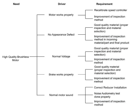 CTQ is used to guide us in indicating the targeted area for doing some improvement specifically [30]. Figure 3 provides information related to customer needs or customer specifications for good quality brushless motor products described in the Critical to Quality (CTQ) tree diagram. Five criteria become specifications for a brushless motor of good quality, such as the motor works properly, no appearance defect, normal voltage, brake works properly, and normal motor sound.