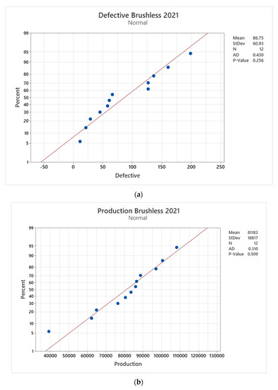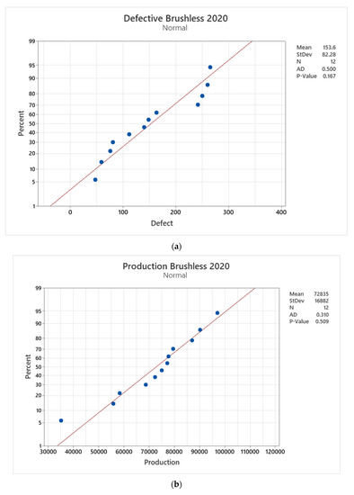 Normality test for 2020 brushless motor data: (a) defective products; (b) production.