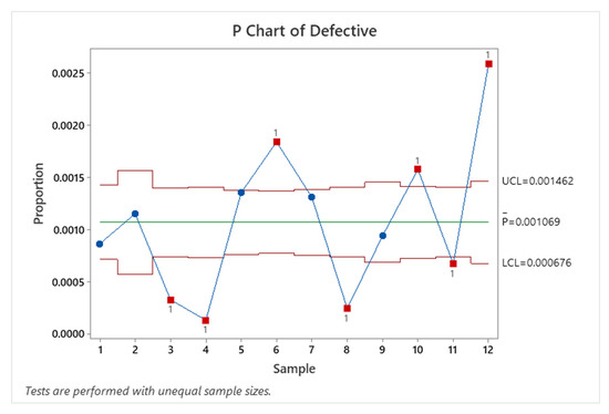 The Measure phase is the precarious phase of the project and focuses on data collection by determining the baseline of the process and figuring out the root causes of the process [22]. The aims are to measure the current condition of the company’s Quality Control by using several tools, such as DPMO and the Control Chart. DPMO is used to find out how many possibilities the production process has to produce defective products in one million opportunities as shown in Formula (1) [14,15]. The DPMO value can be converted to Sigma Level by considering the DPMO result with the Sigma table in Table 1 [25]. The Control Chart is used to determine whether the production process that occurs is controlled or not. The formula that is used in calculating the Control Chart is shown in Formula (2, 3, 4, and 5) [26].