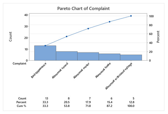 Pareto diagrams are used to find out what problems most often occur. Five issues are most experienced in brushless motor products, as shown in Table 6 and Figure 8.