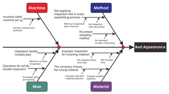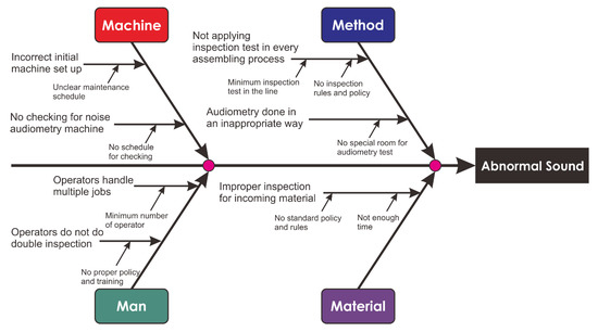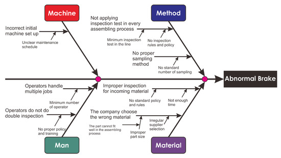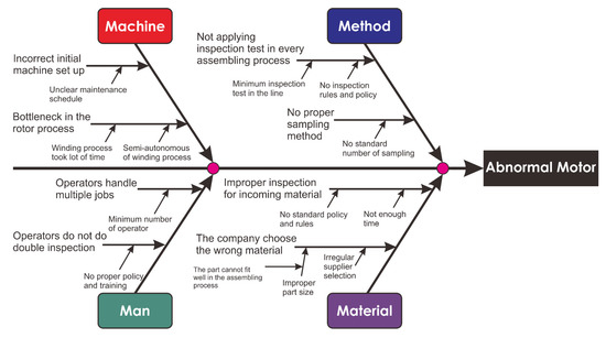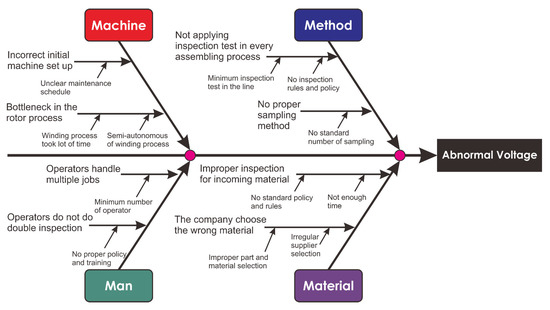 The Fishbone Diagram is used to find out the cause and explore all reasons intensely [31]. Four factors will be analyzed for each complaint, namely, man, method, machine, and material in the complaint against the brushless motor product. Fishbone Diagrams for each complaint are shown in Figure 9, Figure 10, Figure 11, Figure 12 and Figure 13.