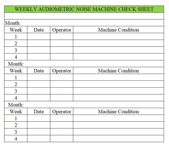 This check sheet is used to monitor the implementation of the noise audiometry test machine inspection, which is carried out every week. The form of the Check Sheet is shown in Figure 14.