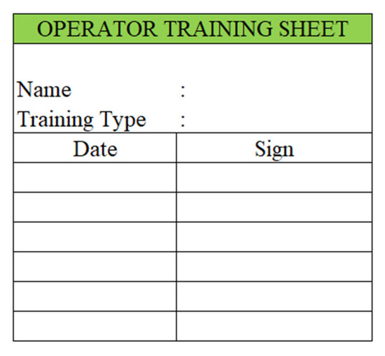 This sheet monitors workers to keep up with the training according to the specified schedule, which is held twice a week for one month. The form of the Operator Training Sheet is shown in Figure 15.