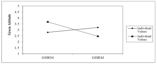 The results of the structural analysis in Smart PLS 3 showed the moderating effect of individual values between GHRM and green attitude (0.067, p < 0.05) as shown in Table 4. The authors in [] recommended drawing an interaction plot to further access the moderating effect. It could be inferred from Figure 2 that the positive impact of the GHRM and green attitude becomes stronger with a higher level of individual values. Thus, our proposed hypothesis is reinforced.