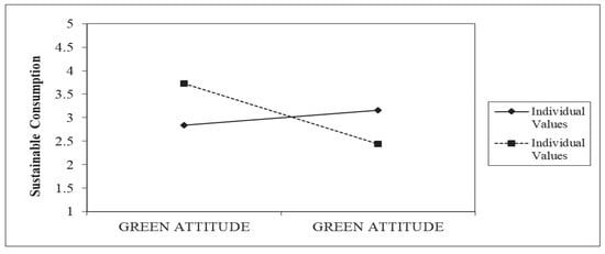 The results of the structural analysis in Smart PLS 3 showed the moderating effect of individual values between green attitude and SCBP (0.082, p < 0.05) as shown in Table 5. The authors in [] recommended drawing an interaction plot to further access the moderating effect. It could be inferred from Figure 3 that the positive impact of the green attitude and SCPB becomes stronger with a higher level of individual values. Thus, our proposed hypothesis is reinforced.