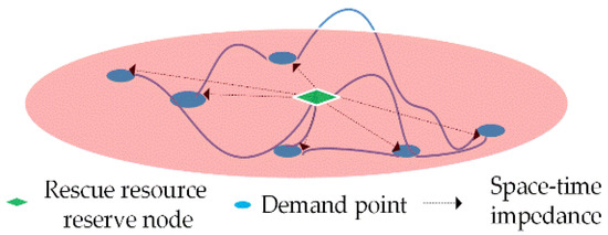 While responding to an emergency, resources and equipment are called upon according to the location and level of response. Additionally, the sooner an emergency is effectively dealt with, the less likely it is to evolve, spread, and diffuse. Therefore, timeliness ought to be the first requirement while completing emergency transportation tasks. The utilization of space-time accessibility to depict the space-time aspects of emergency rescue transportation network nodes and edges can further improve the inaccurate description of the traditional transportation network, mainly the ease of arrival of emergency rescue transportation in time and space, and more closely match the characteristics of emergency transportation networks. As illustrated in Figure 2, space-time accessibility is calculated by the product mean value of an emergency resource reserve node’s capacity attribute size and the space-time impedance overcome value of all cover demand points from that node.