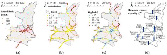 The railway emergency rescue network is constructed using the ArcGIS platform. Additionally, the resource reserve nodes and edges data of China Railway Xi’an Bureau Group Co., Ltd. were sorted out and the results are shown in Figure 5a,b. After completing the construction of the railway emergency rescue network with the actual data, Equations (2) to (6) are used to calculate the transport travel time budget value of each resource reserve node in the logical subnet of the rescue region for this group company. Additionally, the value of can be obtained by combining the evaluation of factors, such as personnel management, resource allocation, and emergency technology of the resource reserve nodes, where , need to be normalized.