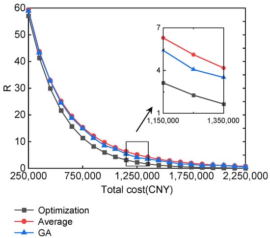 In the execution of the GA allocation algorithm, the objective function of Equation (14) is transformed into the fitness function. Additionally, the parameters are set as follows: crossover probability = 0.6, mutation probability = 0.2, population size = 75 and maximum algebra = 300. For the average allocation algorithm, the total maintenance costs are distributed evenly among all the nodes and edges. The value of is used as the maintenance cost per node and edge, and the remaining parameters are all set as in the optimization allocation algorithm of this paper.