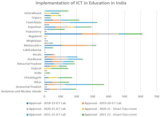 Digital literacy and inclusion are two significant but mainly different fields of research that look at the connections between internet skills and involvement. Linking literacy and exclusion frameworks provides for a more comprehensive view of digital involvement. Certain groups lacked different abilities, which had an impact on how they used the internet [10]. The use of information and communications technology (ICT) has become an essential aspect of our lives today. The use of ICT enables the population to connect with each other, obtain more information and knowledge, as well as enhance trade relations. Therefore, access to ICT has contributed considerably to the economic and sustainable development of the nations. The information on ICT implementation in education in Indian states (Figure 1) provides the rationale behind the study [11].