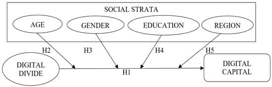 To address the research objectives of the study, the conceptual model (Figure 3) was developed based on an extensive review of the relevant literature. The social strata are composed of various aspects, as the society is differentiated on various levels, such as age, gender, education, region, etc., whose moderating effect is to be assessed through this research. The digital divide is one of the most unexpected outcomes of the digital revolution. It has a detrimental impact on all aspects of society and exacerbates existing socio-economic injustices. It is equally true that the formation of digital capital is the result of existing social and cultural capitals, as well as different forms of inequalities in society [60].