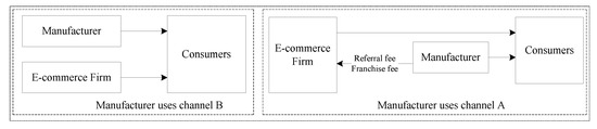 We normalize the unit selling cost for the e-commerce firm selling products through its own online platform and for the manufacturer selling products through channel A. However, assuming that there will incur a unit selling cost if the manufacturer is selling products through channel B, and the selling cost c is constant and related to the product amount. This is because of the scale effect, which reduces the unit cost for the e-commerce firm and will lower this cost for the manufacturer. However, a certain portion, , of the manufacturer’s selling revenue should be paid as a referral fee, and a franchise fee in a fixed period should be provided to the e-commerce firm if the manufacturer will provide the sales product through channel A. Figure 1 depicts the channel structures when the manufacturer sales its products through channel B and channel A respectively.