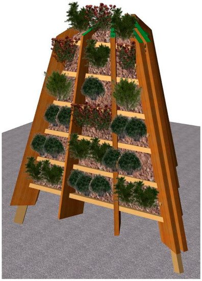 Knowledge from the past and new information acquired through structural tests with wood were transferred to a prototype of a pyramidal shelf used in vertical gardening based on novel composite blocks (Figure 1).