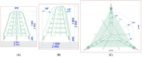 Modular assembly of pyramidal frame structure (A–C). (A) Front view; (B) side view; (C) top view.
