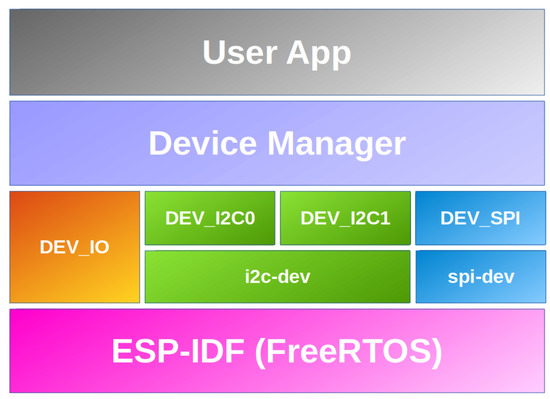 As introduced earlier, the device manager provides four device drivers, namely DEV_IO, DEV_I2C0, DEV_I2C1, and DEV_SPI for the I/O, I2C channel 0, I2C channel 1, and SPI interfaces, respectively. Because the