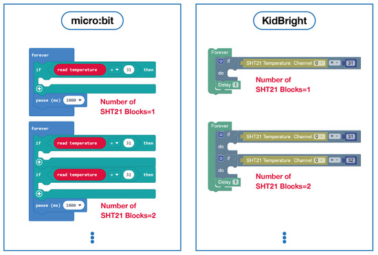 read temperature block. The KidBright and micro:bit’s block-based programs with different numbers of temperature read blocks are shown in