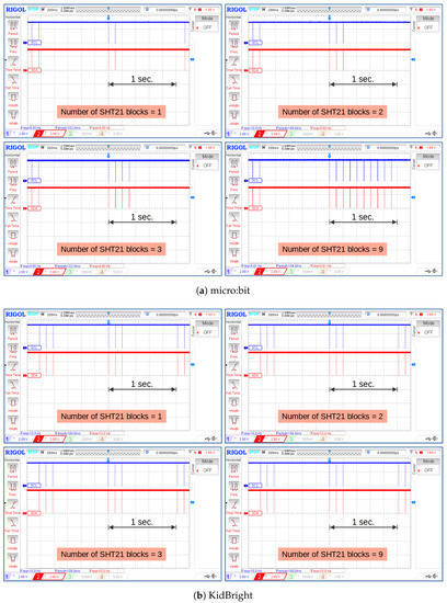 Figure 15 plots the results obtained from the experiment, where the horizontal axis represents the number of temperature read blocks ranging from one to nine, while the vertical axis represents the corresponding number of I2C frames within a given window period of 1 second. As can be observed in the figure, for the micro:bit, the number of I2C frames linearly increases as more micro:bit temperature read blocks are used, whereas, for the KidBright, the number of I2C frames stays constant at three regardless of how many KidBright temperature read blocks it includes, even though its single SHT21 temperature read block requires one I2C frame more than that of the micro:bit. The results imply that the micro:bit SHT block directly accesses the sensor while the KidBright does not. In particular, the results prove that the device manager under the KidBright Engine helps manage the hardware in support of the instruction blocks such that the number of temperature read instruction blocks does not influence the I2C bus occupancy, unlike the micro:bit.
