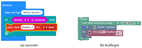 https://lancaster-university.github.io/codal/ (accessed on 31 August 2022)) is now used as a support C++ coding environment for MakeCode), which provides libraries for device drivers and scheduler mechanisms. The platform has been tested with micro:bit, Adafruit Circuit Playground Express, and Arduino boards. In [