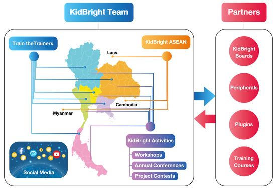 Figure 21. From the figure, in addition to all the endeavors previously presented, one more important part of the whole plan is the partnership. Our partners include academic institutions, makers, and companies that support the KidBright in several forms. For example, we cooperate with universities and makers that help support the KidBright’s regional training and activities, and also with academic professors and makers who design community versions of the KidBright boards, such as versions 1.4 and 1.5. There are maker clubs and companies that offer training courses and/or develop hardware peripherals along with plugins for the KidBright, such as Makerasia (
