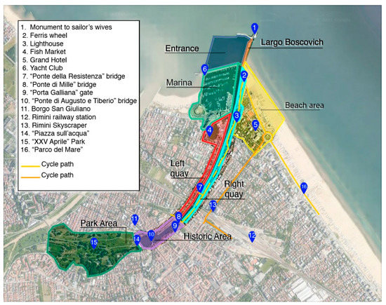 The EU Interreg Italy–Croatia Cooperation Programme addresses key socioeconomic challenges related to the sustainable growth of small realities across Europe [3]. Given the richness of cultural and environmental resources that require appropriate conservation in the programme area, it is relevant to identify a strategy to develop and preserve the heritage and at the same time promote it for tourism. Since a large part of the Adriatic Sea is subject to national jurisdiction limitations, it is necessary to intervene with cross-border cooperation projects to ensure efficient protection of marine biodiversity and to make sustainable use of coastal and marine resources. The Interreg Italy–Croatia programme enhances the application of innovative methods to reduce the environmental impact in marine and coastal areas. The activities carried out in the FRAMESPORT (FRAMEwork Initiative Fostering the Sustainable Development of Adriatic Small PORTs) Interreg Italy–Croatia project [4] are aimed at supporting the overall and sustainable growth of Adriatic Sea small ports through a long-term strategy, enhancing their socioeconomic role in the development of coastal areas. In this contribution to the research, a project pertaining to this specific domain and applied to the Rimini Canal Port was analysed and developed.